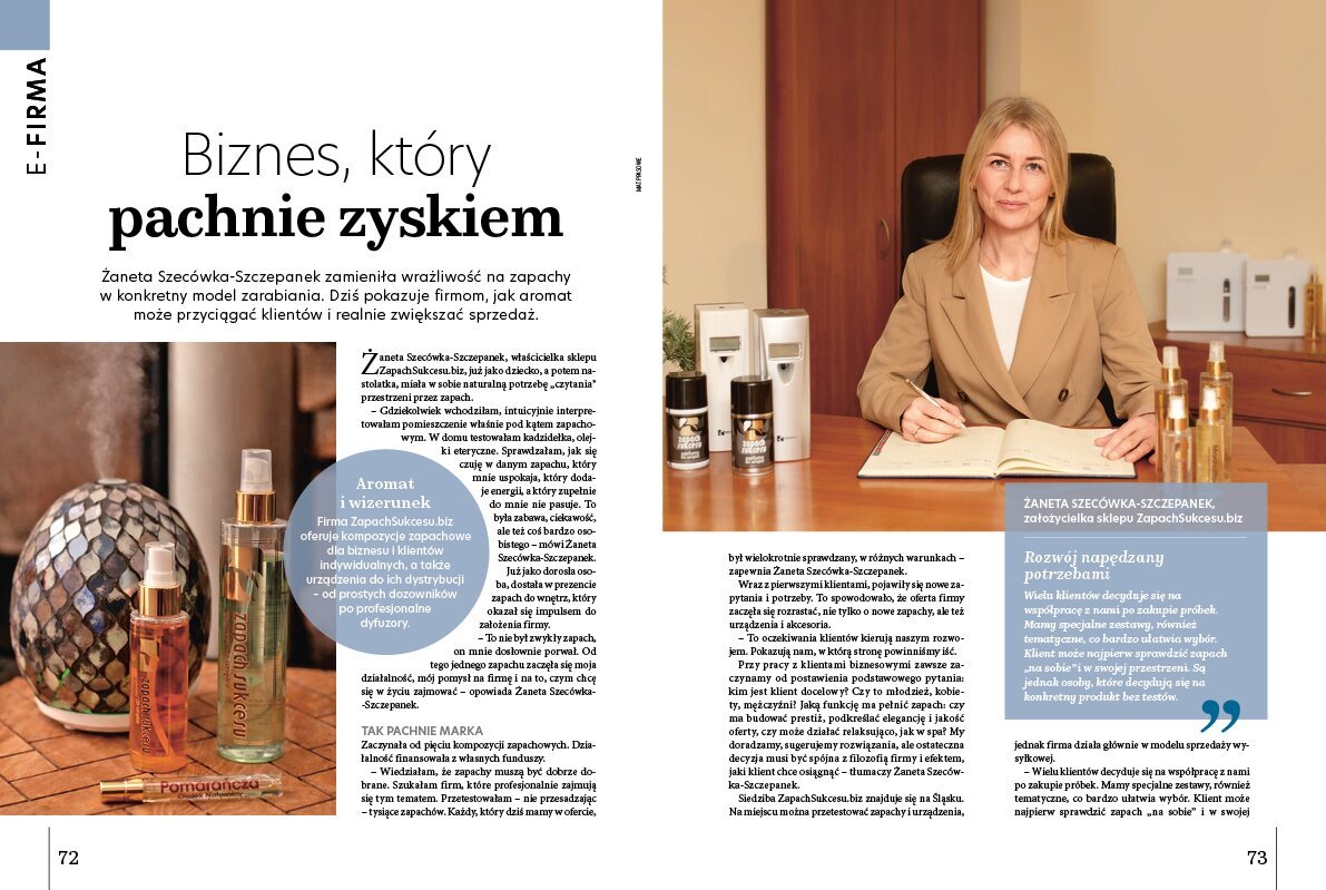 Żaneta Szecówka-Szczepanek zamieniła wrażliwość na zapachy w konkretny model zarabiania. Dziś pokazuje firmom, jak aromat może przyciągać klientów i realnie zwiększać sprzedaż.